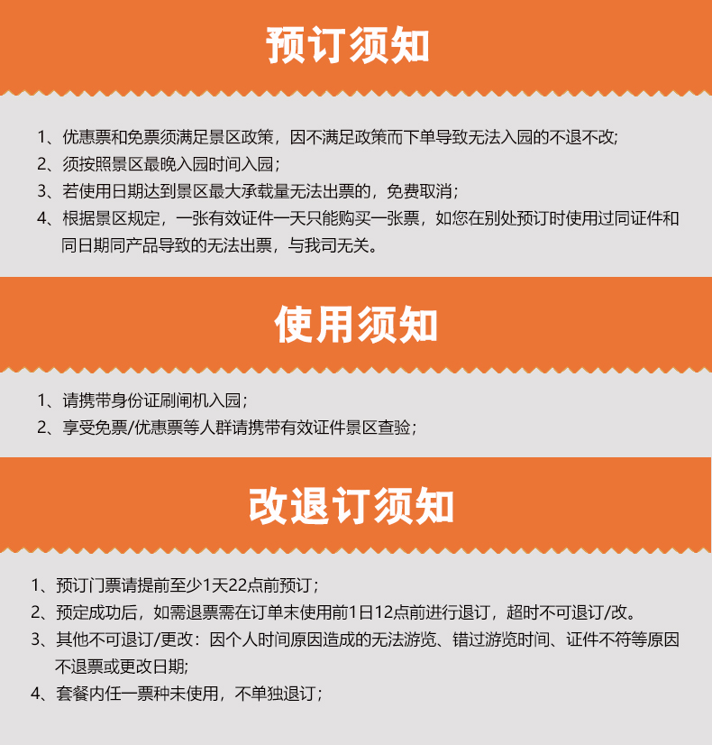 3、其他不可退订/更改:因个人时间原因造成的无法游览、错过游览时间、证件不符等原因不退票或更改日期;