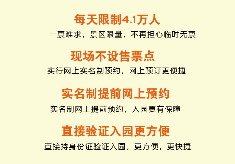 4、根据景区规定,一张有效证件一天只能购买一张票,如您在别处预订时使用过同证件和同日期同产品导致的无法出票,与我司无关。