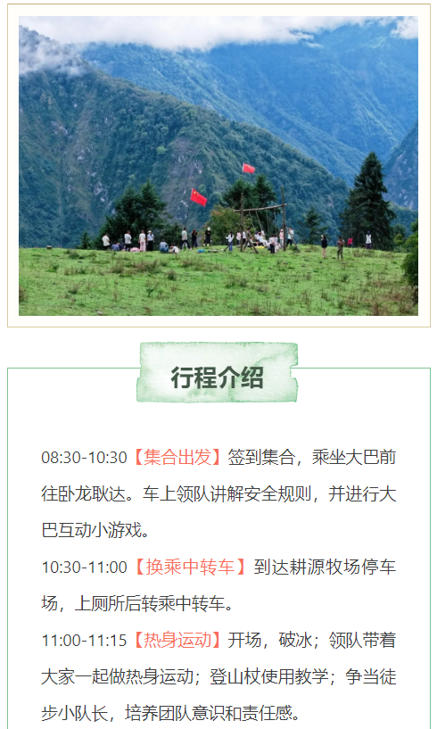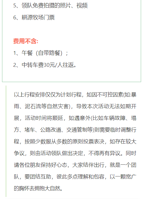 4.团队活动请注意不要迟到,活动不接受任何迟到理由。诸如:打不到车、找不到集合点、有事耽搁等等,超过出发时间未到则视为放弃活动,且迟到不退费不更改不延期。
