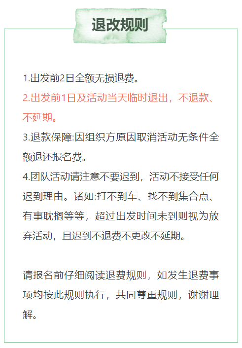 2.出发前1日及活动当天临时退出,不退款、不延期。