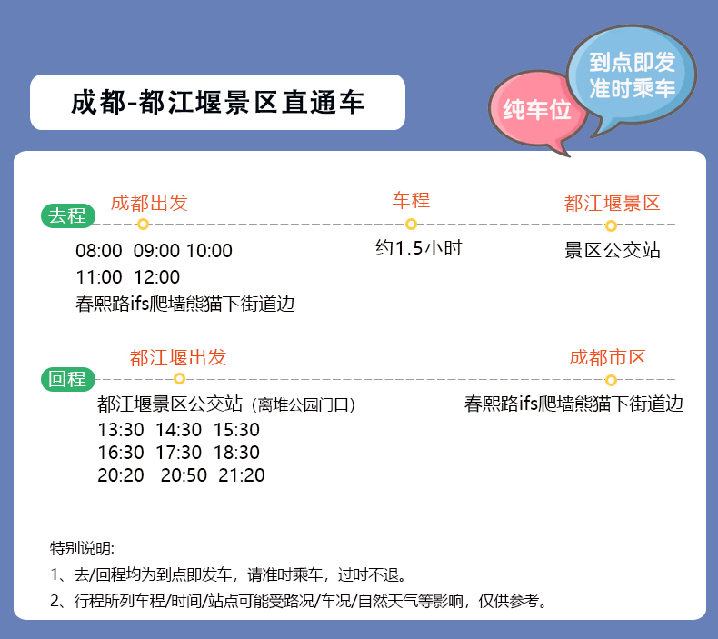 3/如是【去程】请提前10分钟到IFS熊猫爬楼下面联系现场工作人员18040336686安排车位,如是【回程】请提前30分钟到都江堰景区公交站联系现场工作人员18884567188安排车位;