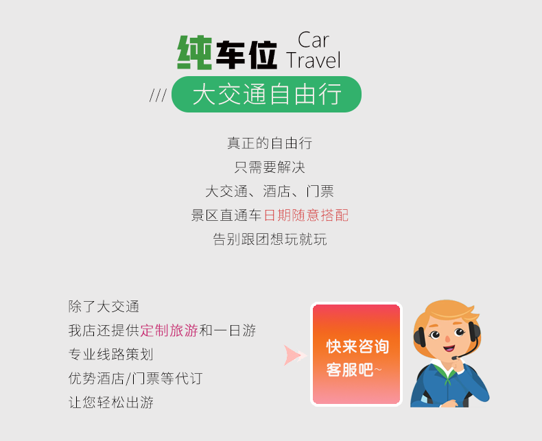 4、本产品包含车位、行程设计、领队服务,套餐内任一未使用,不单独退费或折算差价。