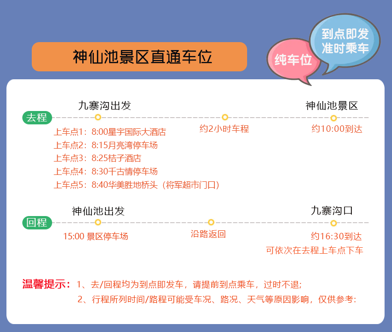2、行程所列站点和上车时间准时发车,请提前候车,过时不候。
