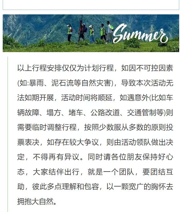 4.团队活动请注意不要迟到,活动不接受任何迟到理由。诸如:打不到车、找不到集合点、有事耽搁等等,超过出发时间未到则视为放弃活动,且迟到不退费不更改不延期。