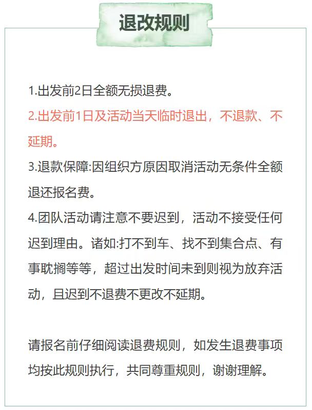 2.出发前1日及活动当天临时退出,不退款、不延期。