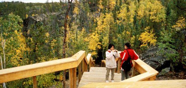 瀑布位于黄刀镇以东约50公里处,徒步经过几座小山,秋季穿行于蜿蜒曲折的小山路,感受极地秋季的生态环境,趣味盎然,登上山顶,眺望极地绵延山峦,风光豁然,秋色艳丽,飞鸟野鸡小动物等出没山间,活跃可爱,趣味无穷,瀑布隐于山间,虽非巨流奔腾,但澄澈清爽风景怡然。到极地进入深山领略风光,了解原住民生活生态环境和习俗,实在是一次极其难得的实地感受。