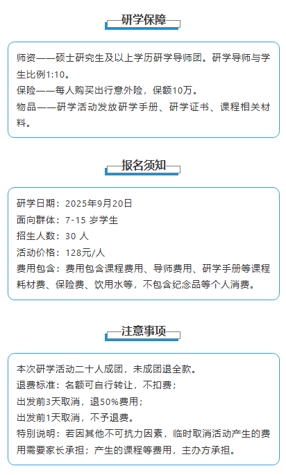 本次研学活动二十人成团,未成团退全款。