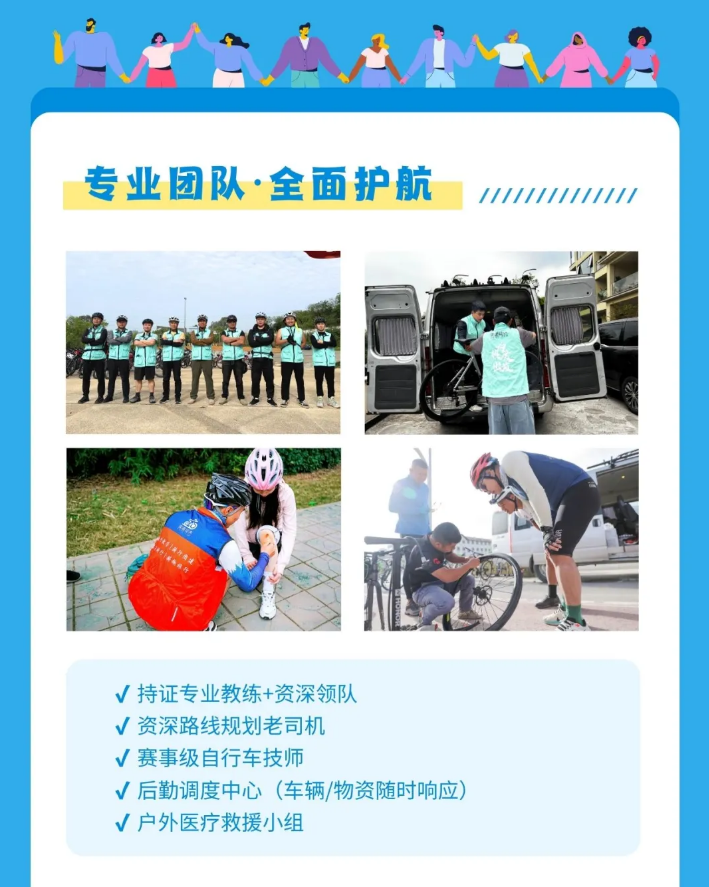 1、骑行教练:专业骑行教练带队骑行,保障大家骑行安全。(领队配比不低于1:10)