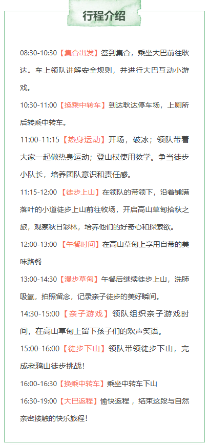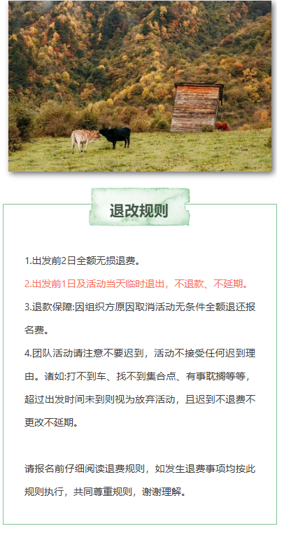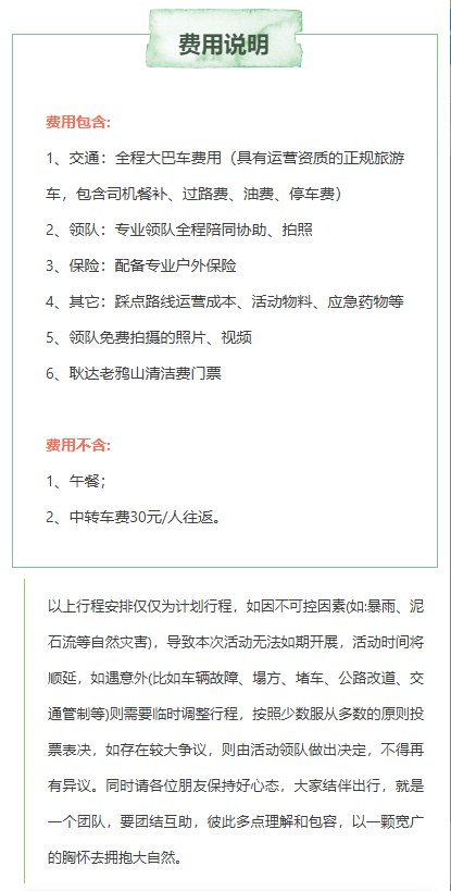 4.团队活动请注意不要迟到,活动不接受任何迟到理由。诸如:打不到车、找不到集合点、有事耽搁等等,超过出发时间未到则视为放弃活动,且迟到不退费不更改不延期。