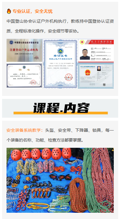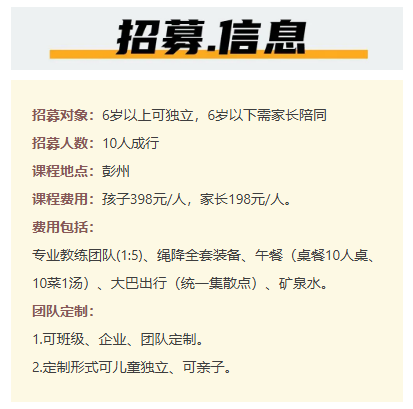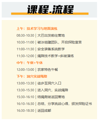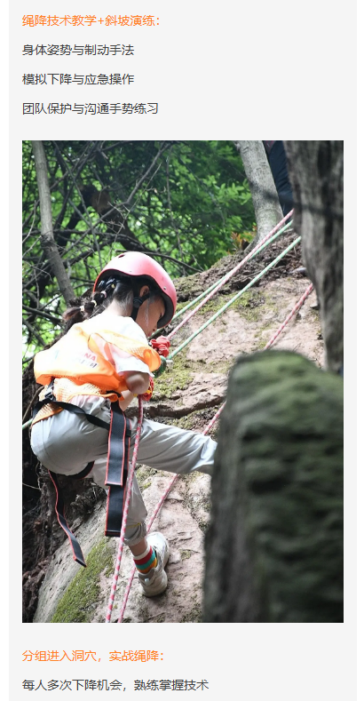 专业教练团队(1:5)、绳降全套装备、午餐(桌餐10人桌、10菜1汤)、大巴出行(统一集散点)、矿泉水。