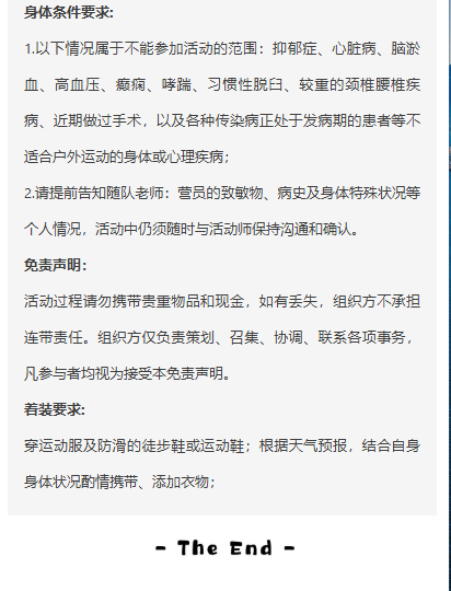 活动过程请勿携带贵重物品和现金,如有丢失,组织方不承担连带责任。组织方仅负责策划、召集、协调、联系各项事务,凡参与者均视为接受本免责声明。