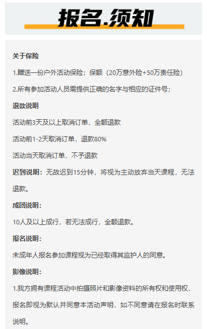 1.我方拥有课程活动中拍摄照片和影像资料的所有权和使用权,报名即视为默认并同意本活动声明,如不同意请在报名时联系说明。