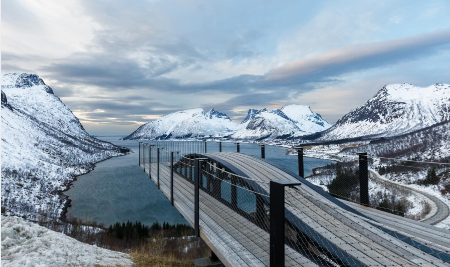 建于1958年的特罗姆瑟大桥是北极内壮观的建筑,横跨特罗姆瑟和山妖小镇,是特罗姆瑟的标志性建筑,跨海大桥的一侧是雪山峰式外形别致鲜明雪山小镇,许多关于特罗姆瑟的明信片都是在此拍摄。